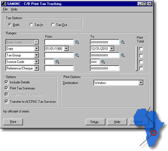 When printing the Cashbook Tax Tracking report a "Transfer to ACCPAC" option can be selected which will update the ACCPAC Tax Services Tax Tracking report with the Cashbook Tax Tracking information. This new functionality will be particularly useful for users who wish to maintain one consolidated Tax Tracking Report in ACCPAC Tax Services.